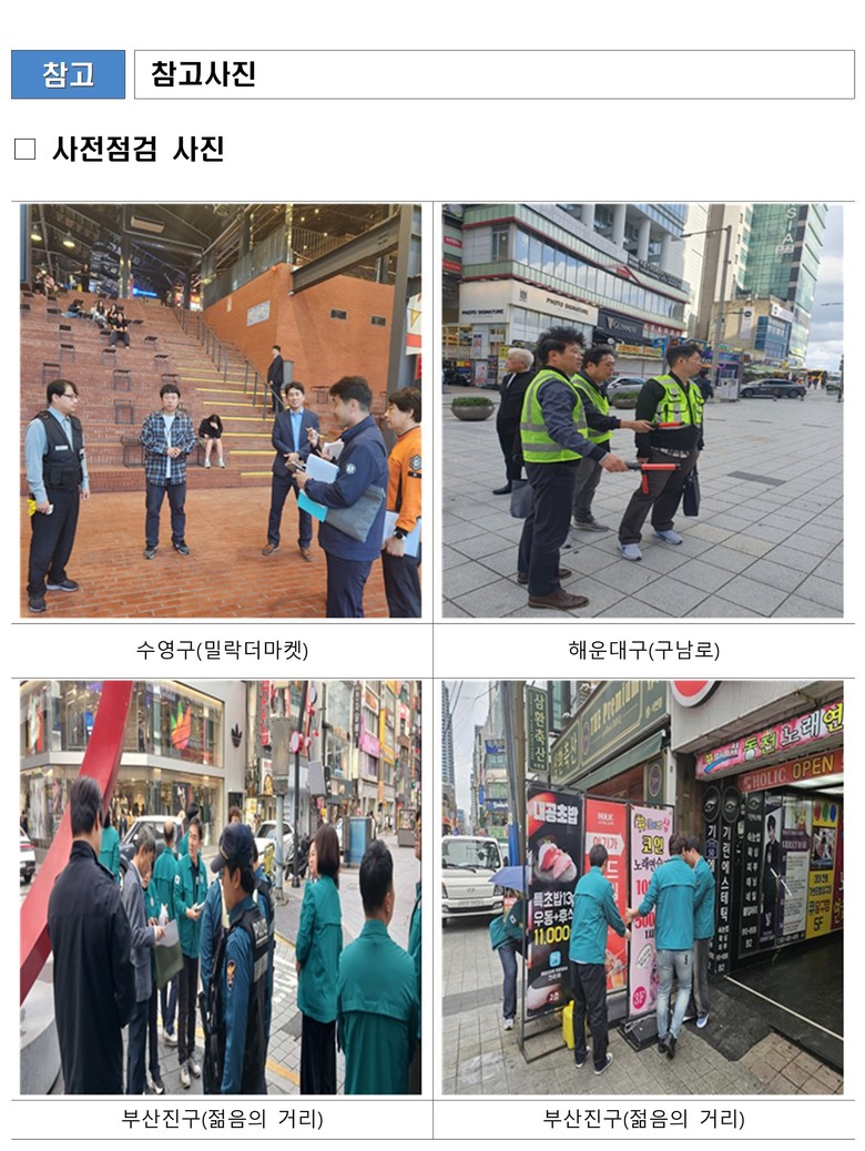 특별대책기간에는 다중운집 인파가 예상되는 ▲[부산진구] 서면 젊음의거리 ▲[수영구] 밀락더마켓 및 광안리해변 ▲[해운대] 구남로 일원 등 3개소를 집중 관리한다.