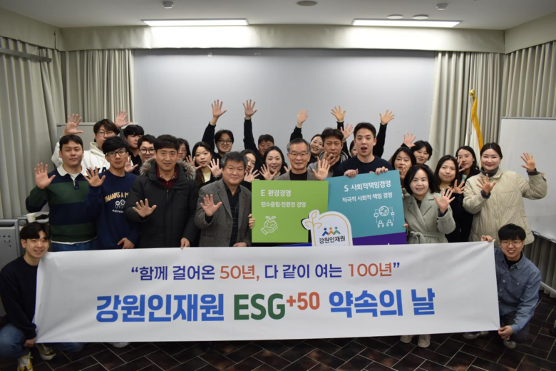 ESG+50은 강원인재원 설립 50주년을 맞아 설정된‘함께 걸어온 50년, 다 같이 여는 100년’이라는 슬로건 아래, 지속가능한 미래 50년을 선도하는 강원인재원만의 차별화된 ESG 브랜드이다.