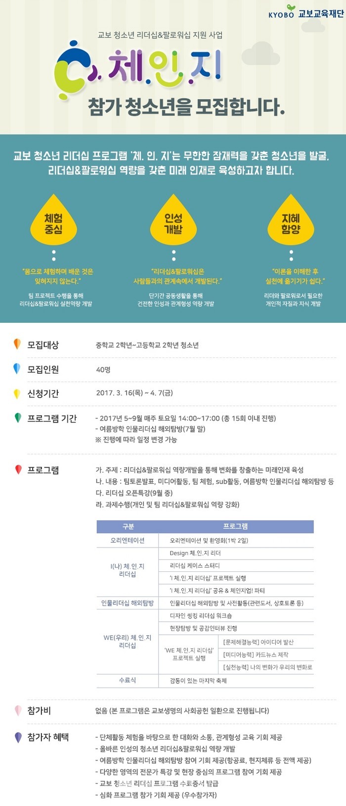 교보 청소년 리더십 프로그램 ‘체.인.지’는 중학교 2학년부터 고등학교 2학년까지 청소년이라면 누구나 신청 가능하다. 오는 4월 7일까지 ‘체.인.지’ 홈페이지 를 통해 참가신청을 하면된다.