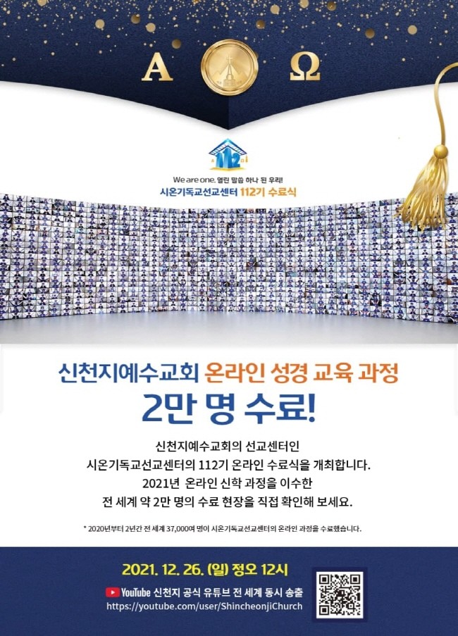 신천지예수교회는 오는 26일 시온기독교선교센터 112기 온라인 수료식을 개최하고 총 1만 8천838명(국내 1만 1천162명, 해외 7천676명)의 수료생을 배출한다고 20일 밝혔다. 26일 정오부터 진행되는 수료식은 신천지예수교회 공식 유튜브를 통해 전 세계로 중계된다.