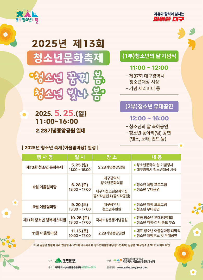 대구광역시가 주최하고 대구행복진흥원 청소년활동진흥센터가 주관하는 ‘제13회 청소년문화축제’는 5월 청소년의 달을 맞아 청소년기획단*이 직접 주도적으로 기획, 2·28기념중앙공원에서 지역 청소년과 가족, 시민 등 300여 명이 참석한 가운데 기념행사와 어울림마당이 펼쳐진다.