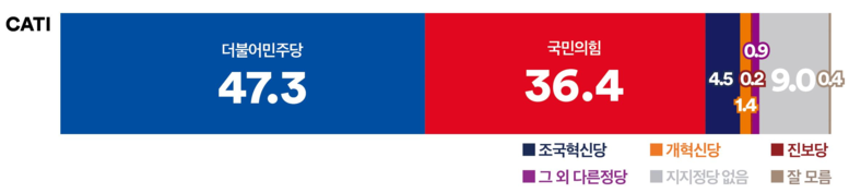 ‘여론조사꽃’ 정당 지지율 민주 47.3% vs 국힘 36.4% vs 조국 4.5%
