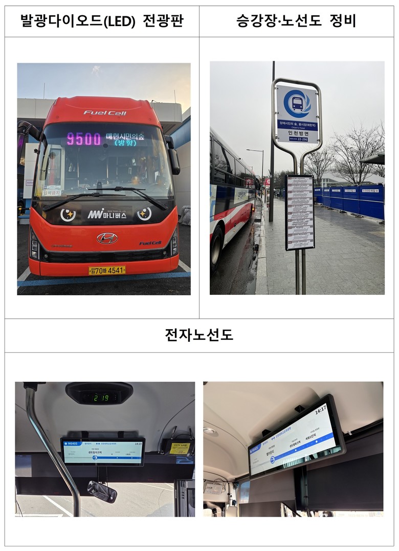또한 이용 수요가 많은 노후 정류장을 개선하고 노선도를 새롭게 제작·설치했으며, 출퇴근 혼잡 시간대 대기 질서와 승차 편의성 향상을 위해 승차 위치 표지판도 설치했다. 아울러 버스 전면부에는 가시성을 높인 발광다이오드(LED) 전광판을, 내부에는 전자노선도를 설치해 정류소 안내와 정보 제공 기능을 강화했다. 해당 시설은 현재 전체 노선의 50% 이상에 설치를 완료했으며, 내년 초까지 전 노선 설치를 마칠 예정이다.
