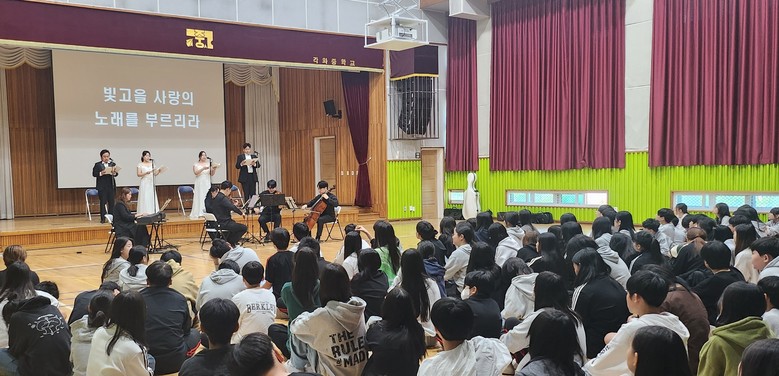 | ▲ 광주시교육청이 2일 각화중학교에서 ‘학교로 찾아가는 5·18 문화예술공연’을 개최하고 앞으로 5월 동안 7개 학교를 방문해 공연할 예정이다. 공연은 ‘빛이여! 빛이여! 빛고을이여!!’를 공연명으로 전문 공연단체 ‘온챔버오케스트라’가 참여한 가운데 관현악, 합창, 독창, 해설, 문학이 어울려진 창작 오라토리오로 진행된다. / 제공 광주광역시교육청 |