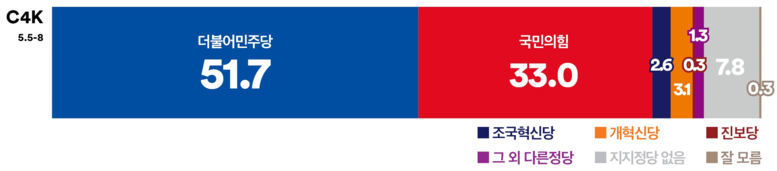 [세계타임즈 = 심귀영 기자] ‘여론조사꽃’이 5월 5일부터 6일, 5월 7일부터 8일에 각각 이틀씩 진행한 전화면접조사 결과를 합산, 분석한 결과, ‘더불어민주당’은 51.7%의 지지율로 ‘국민의힘’(33.0%)을 18.7%p 앞서는 것으로 나타났다. ‘조국혁신당’은 2.6%를 기록했으며, ‘더불어민주당’과 ‘조국혁신당’의 합산 지지율은 54.3%로, ‘국민의힘’보다 21.3%p 높았다.