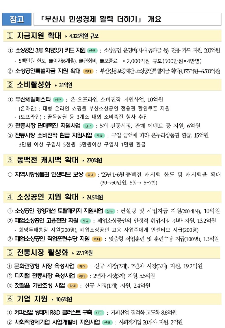 '민생경제 활력 더하기'는 고물가로 인한 내수 부진 및 소비 위축에 따라 어려움을 겪고 있는 소상공인과 전통시장을 지원하기 위해 ▲자금 지원 확대 ▲소비 활성화 ▲동백전 캐시백 확대 ▲소상공인 지원 확대 ▲폐업 소상공인 고용 전환 촉진 ▲전통시장 활성화 등 총 4천688억 원 규모, 14개 사업으로 구성했다.
