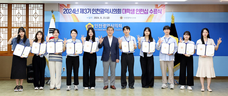 인천시의회는 23일 접견실에서 정해권 의장을 비롯해 김상섭 사무처장, 대학생 인턴 10명 등이 참석한 가운데 ‘제3기 대학생 인턴 수료식’을 개최했다.