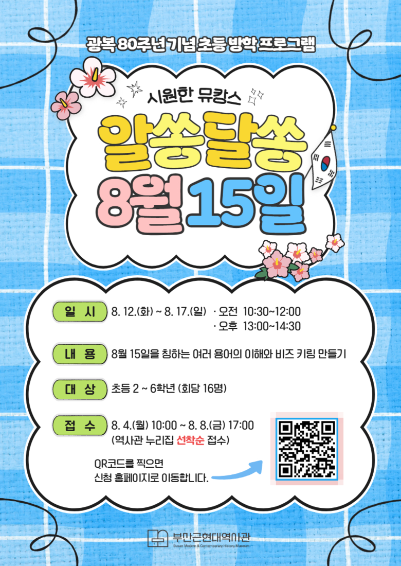 ◈ 8.4. 10:00부터 역사관 누리집에서 선착순 접수 진행… 회당 초등 2~6학년 16명 모집 [부산 세계타임즈=이용우 기자] 부산근현대역사관(이하 역사관)은 오는 8월 12일부터 17일까지 초등학생 대상 방학프로그램 <시원한 뮤캉스> '알쏭달쏭 8월 15일'을 운영한다고 밝혔다.