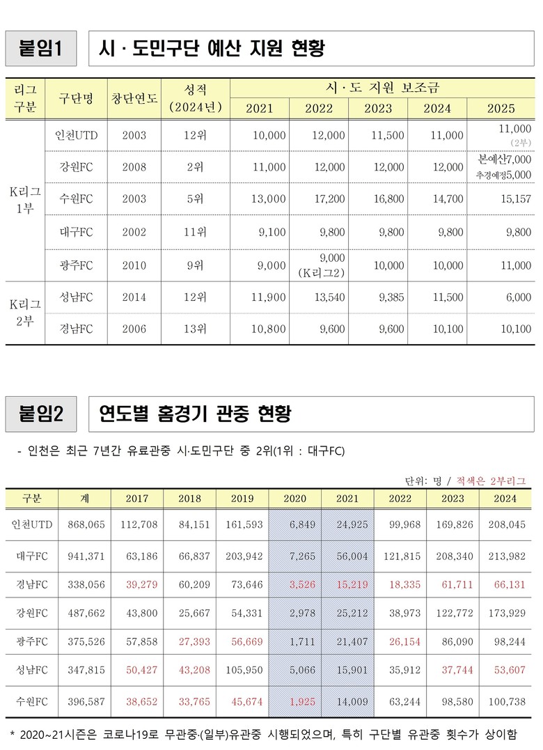 2025년에도 전년과 동일한 160억 원(시비 110억 원, 경제청 50억 원) 규모의 예산을 유지하며 구단의 안정적 운영을 도왔다. 이를 바탕으로 인천유나이티드는 선수단 보강과 유소년 시스템 확충, 홈경기 운영 개선 등 기반을 다졌다.