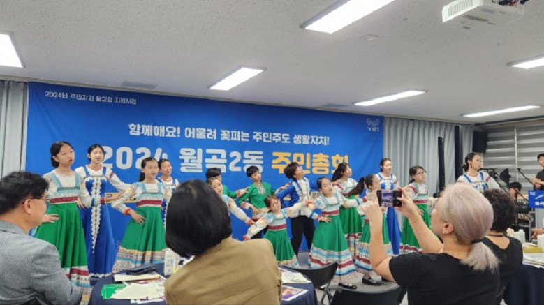[고려인마을=세계타임즈 이상호 기자] 광주 고려인마을 어린이합창단이 최근 개최된 광주 광산구 월곡2동 주민총회 무대에 서 선주민들로부터 뜨거운 박수를 받았다.
