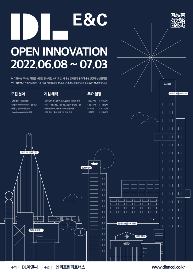 이번 프로그램은 공모전 방식으로 진행된다. 우수한 아이디어나 기술을 보유한 스타트업, 예비창업자, 중소기업 및 연구팀 등이 지원할 수 있다. 건설현장 니즈(Needs) 해결, 건설산업 디지털 트랜스포메이션 기술 제안, 친환경 탈탄소 사업, 신사업 모델 제안 등 총 4가지 분야에서 참여 회사를 모집한다. 참여를 원하는 스타트업은 7월 3일까지 DL이앤씨 오픈 이노베이션 홈페이지를 통해 지원서를 제출하면 된다. 공모 결과는 7월 말에 발표할 예정이다.