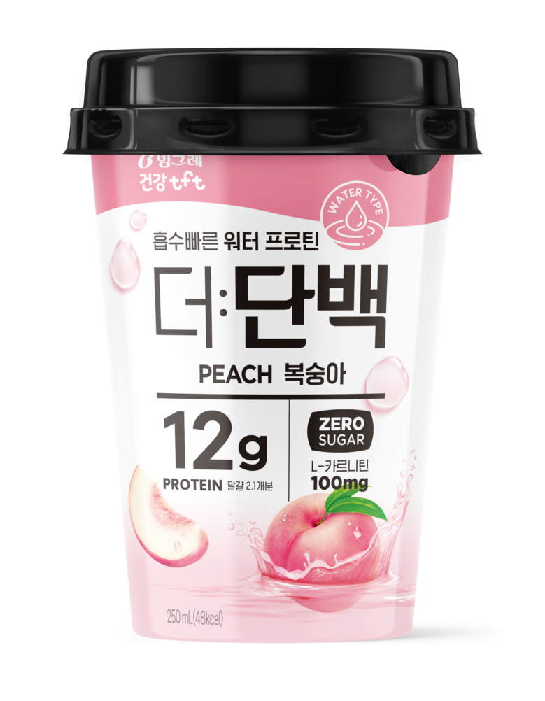신제품 ‘더단백 워터프로틴 복숭아’는 단백질 12g(1컵 250ml 기준)을 함유한 상큼하고 깔끔한 단백질 음료로, 운동 전후 부담 없이 단백질을 보충할 수 있도록 개발되었다.