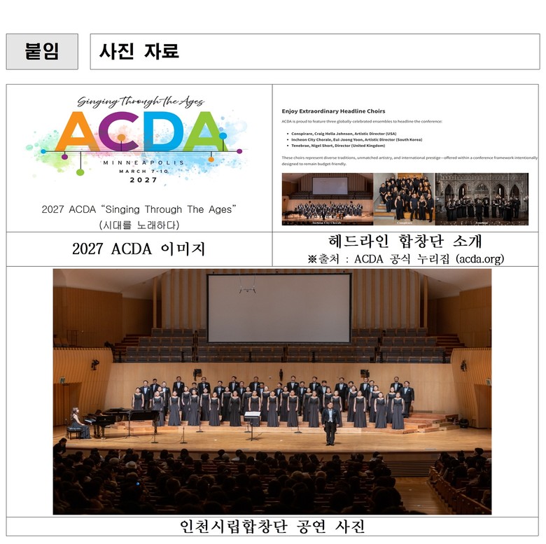 미국합창지휘자연합회(ACDA) 내셔널 컨벤션은 1959년 시작된 세계적인 합창 축제로, 전 세계 합창 지휘자와 음악가 약 1만 명 이상이 참여하는 최대 규모의 합창 행사다. 2년마다 개최되며, 대부분의 합창단이 오디션을 통해 참가하는 가운데 단 3개 합창단만이 ‘초청 콰이어(Invited Choir)’로 선정된다. 2027년에는 그래미 어워드(2015) 수상 합창단 ‘Conspirare’, BBC 뮤직 어워드(2012·2016) 수상 및 그라모폰 어워드(2013) 노미네이트 합창단 ‘Tenebrae’와 함께 인천시립합창단이 초청돼 세계 최정상급 합창단들과 나란히 무대를 꾸미게 된다.