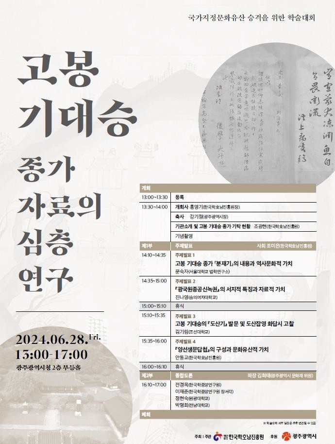 이번 학술대회는 고봉 기대승 종가에서 (재)한국학호남진흥원으로 기탁한 1100여점의 자료 소개를 시작으로 주제발표와 종합토론이 이어진다.