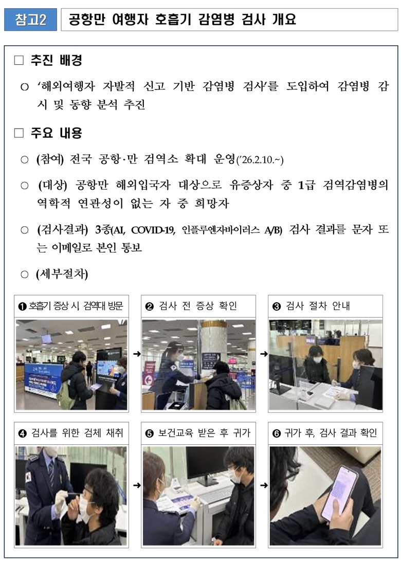 2월 10일부터 전국 공항만에서는 국내 입국하는 여행자를 대상으로 희망자에 한해 호흡기감염병 3종(동물인플루엔자 인체감염증, 코로나19, 인플루엔자) 검사*를 무료로 시행 중이다. 호흡기감염병 의심증상이 있는 해외여행객은 이를 적극 활용하는 것이 권장된다.