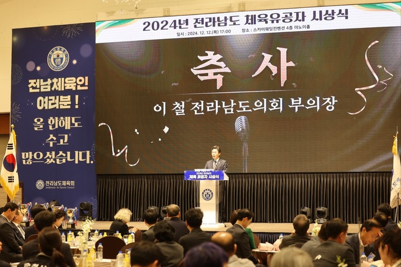 [전남 세계타임즈=우덕현 기자] 전라남도의회 이철 부의장(더불어민주당·완도1)은 12월 12일 남악 스카이웨딩컨벤션에서 열린 ‘2024년 전라남도 체육 유공자 시상식’에 참석해 전남 체육 유공자들과 관련 체육인들에게 감사와 축하의 메시지를 전했다.