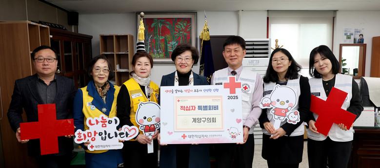 [계양구 세계타임즈=심하린 기자] 인천 계양구의회(의장 신정숙)는 20일 의장실에서 대한적십자사 인천지사 홍성조 사무처장과 대한적십자사봉사회 계양지구협의회(회장 이정숙) 등 관계 임원들이 참석한 가운데 2025년 적십자 특별회비를 전달했다.