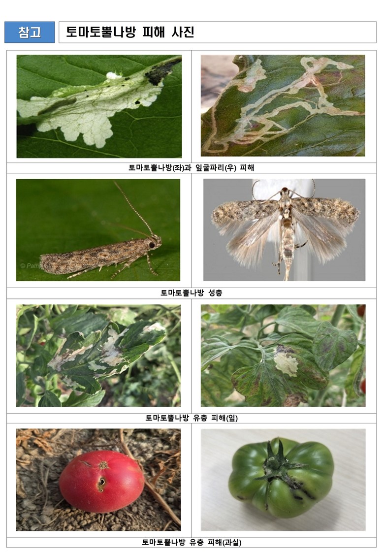 토마토뿔나방은 농작물의 잎을 뚫고 들어가 내부조직을 넓게 갉아 먹어 과실에 구멍을 내는 양상을 보인다. 반면, 어린잎 표면에 구불구불하고, 가느다란 흰색 터널을 형성하는 ‘잎굴파리 피해증상’과도 유사한 면이 있어 정확하게 진단이 필요하다.