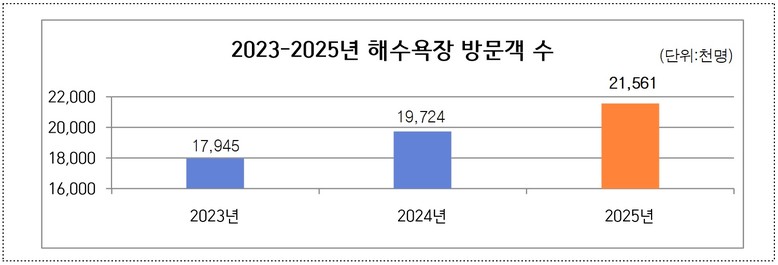 올해 9월 7일 기준 부산 해수욕장 방문객 수는 2천156만 1천 명으로, 전년 대비 9.31퍼센트(%)의 증가율을 기록하며 코로나(2020년) 이후 최다 방문 기록을 경신했다.