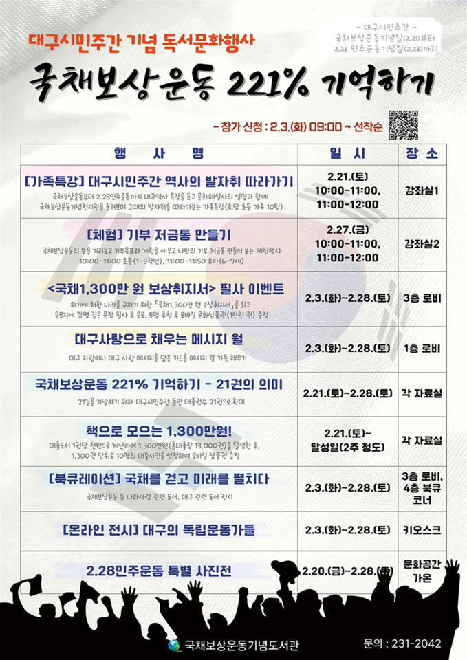 사전 신청이 필요한 프로그램은 2월 3일(화) 오전 9시부터 국채보상운동기념도서관 홈페이지(library.daegu.go.kr/gukbo)를 통해 선착순 접수로 진행되며, 행사와 관련한 자세한 사항은 홈페이지 공지사항을 확인하거나 독서문화과(☎231-2042)로 문의하면 된다.