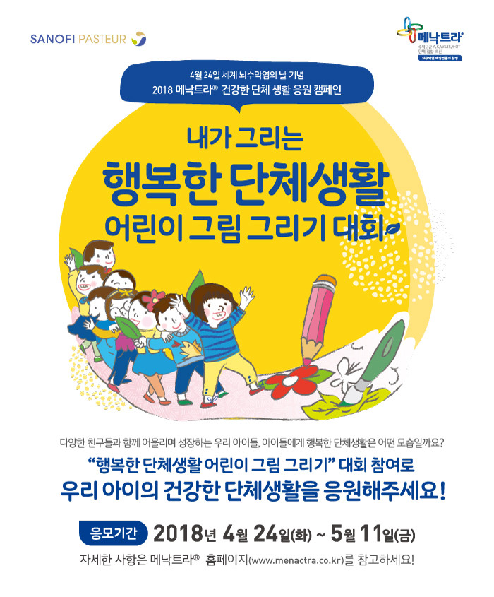 이번 메낙트라® 그림 그리기 대회는 단체생활 시 특히 발병 위험이 높은 수막구균성 질환 예방에 대한 인식 제고 캠페인의 일환으로 진행된다. 사노피 파스퇴르는 지난 2016년부터 ‘건강한 단체생활 응원 캠페인’을 진행해 왔으며, 지난 2015년 아기모델 콘테스트에 이어 2017년에는 우리 아이 모델 선발대회를 진행하는 등 어린이들이 쉽고 재미있게 참여할 수 있는 이벤트들을 개최해왔다.