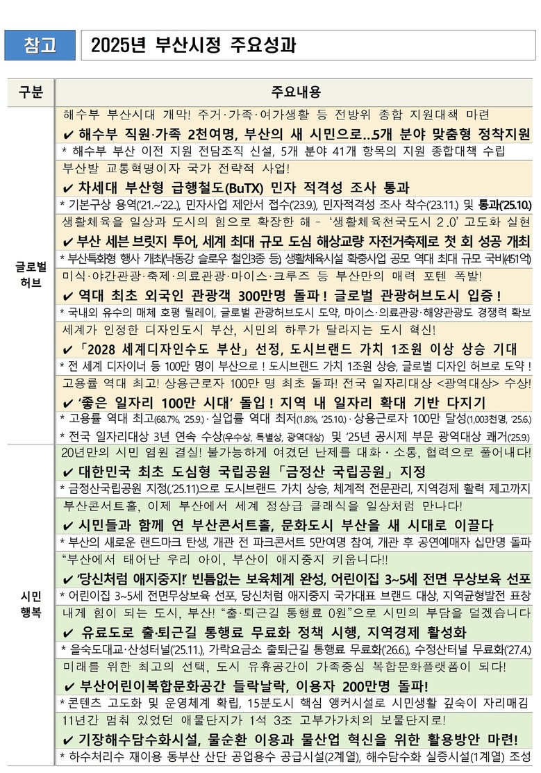 박형준 시장은 “2025년은 부산의 잠재력을 극대화하며 글로벌 허브도시, 대한민국의 새로운 혁신성장 거점으로서의 가능성을 입증한 성과 창출의 해”라며, “내년은 그동안의 변화와 성장을 바탕으로 글로벌 허브도시, 시민행복도시라는 양대 지향점 중심의 '다시 태어나도 살고 싶은 부산'을 실현하겠다”라고 전했다.