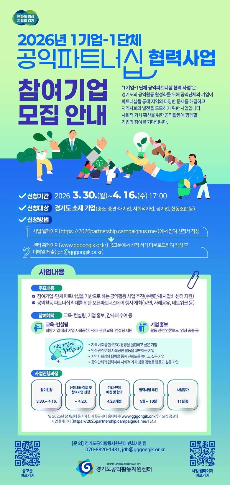 자세한 내용은 경기도공익활동지원센터 누리집(www.gggongik.or.kr) 및 사업 안내 페이지 (https://2026partnership.campaignus.me/)에서 확인할 수 있으며, 관련 문의는 센터 변화지원팀(070-8820-1481)으로 하면 된다.