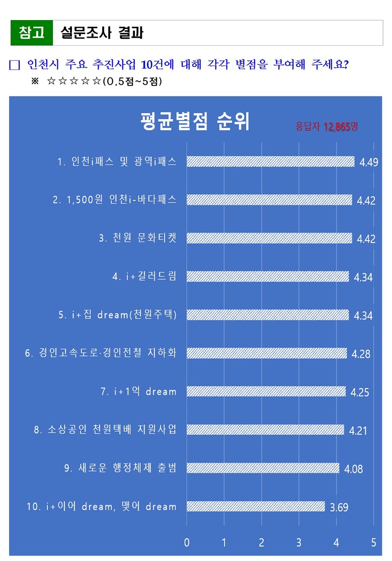 설문은 인천시가 추진 중인 10대 주요 사업에 대해 5점 만점의 별점 평가 방식으로 진행됐으며, 전반적으로 높은 점수를 받았다. 특히 교통 분야 정책이 가장 높은 평가를 받았고, 이어 천원 문화티켓, 천원주택 등 시민 체감도가 높은 ‘천원정책’에 대한 만족도가 높았다.