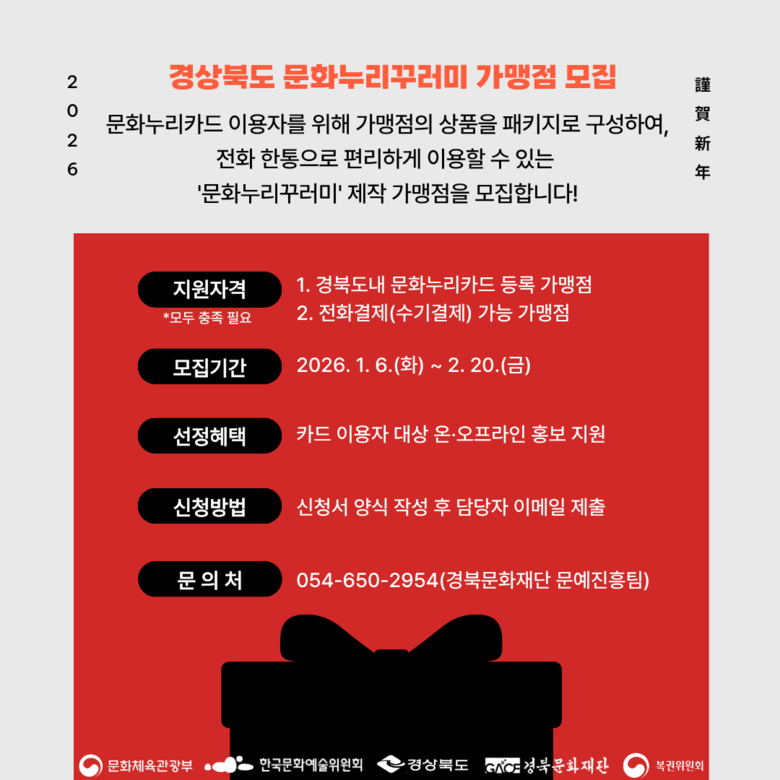 또한, 문화누리카드 사용 활성화를 위한 ‘경상북도 문화누리꾸러미 가맹점’을 2월 20일까지 모집한다. 문화누리꾸러미는 도내 가맹점이 직접 2종 이상의 상품으로 구성한 15만 원 이내의 맞춤형 기획 상품이다. 전화결제가 가능한 경북도내 문화누리카드 가맹점은 누구나 신청이 가능하며, 선정된 가맹점에게는 상품 포장용품 지원과 함께 및 온·오프라인 홍보 혜택이 주어질 예정이다.