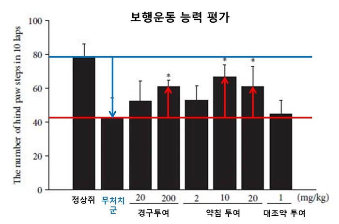 | ▲그림에 따르면 척추관협착증을 유도한 쥐의 걸음이 크게 줄어든 반면 '신바로2'를 투여한 쥐들은 보행운동 능력이 유의미하게 회복됐다. |