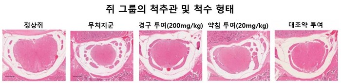 또 '신바로2'를 투여한 쥐들의 척수가 회복되는 현상도 확인할 수 있었다. 정상 쥐들은 타원형의 척수와 손상되지 않은 척추관을 보였지만 척추관협착증을 유도한 쥐는 척추관이 좁아져 척수의 모형이 망가졌다. 하지만 신바로2를 투여한 쥐들의 척수는 정상 형태로 구조적 회복을 하는 모습을 보였다.