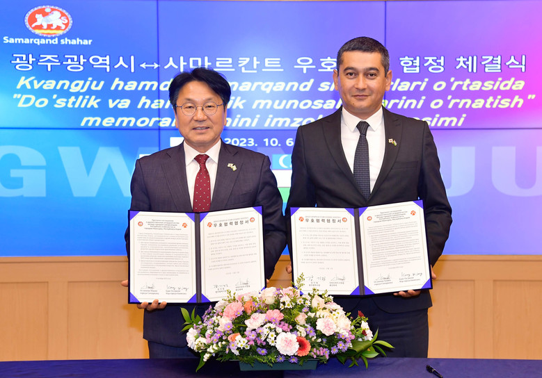 [광주 세계타임즈=손권일 기자] 광주광역시(시장 강기정)와 실크로드의 중심지 우즈베키스탄 사마르칸트시가 6일 시청 비즈니스룸에서 우호협력 협정을 체결했다.