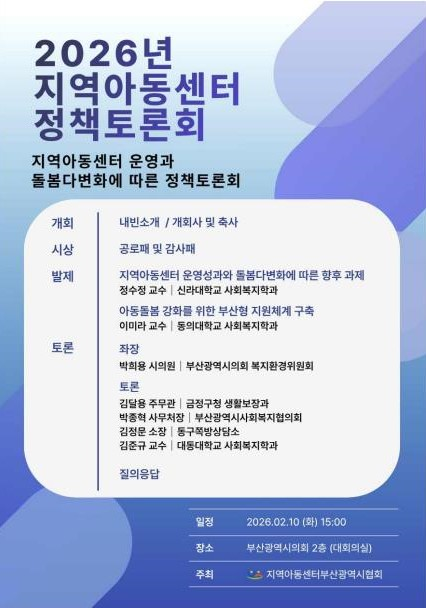 ◈ 시, 토론회에서 제시된 다양한 의견을 바탕으로 지역아동센터 정책을 점검하고, 아동 돌봄 정책에 적극 반영할 계획 [부산 세계타임즈=이용우 기자] 부산시(시장 박형준)는 오늘(10일) 오후 3시 시의회 대회의실에서 지역아동센터 부산광역시협회 주최로 「2026년 지역아동센터 정책토론회」(이하 토론회)가 열린다고 밝혔다.