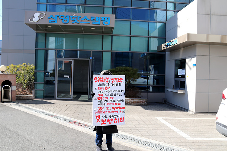 (성우하이텍의 경주 핫스템핑 공장 사내 하청업체의 전 대표 정수연씨가 경주에 위치한 성우하이텍 산하 핫스템핑 공장 앞에서 1인 시위를 하고 있다)