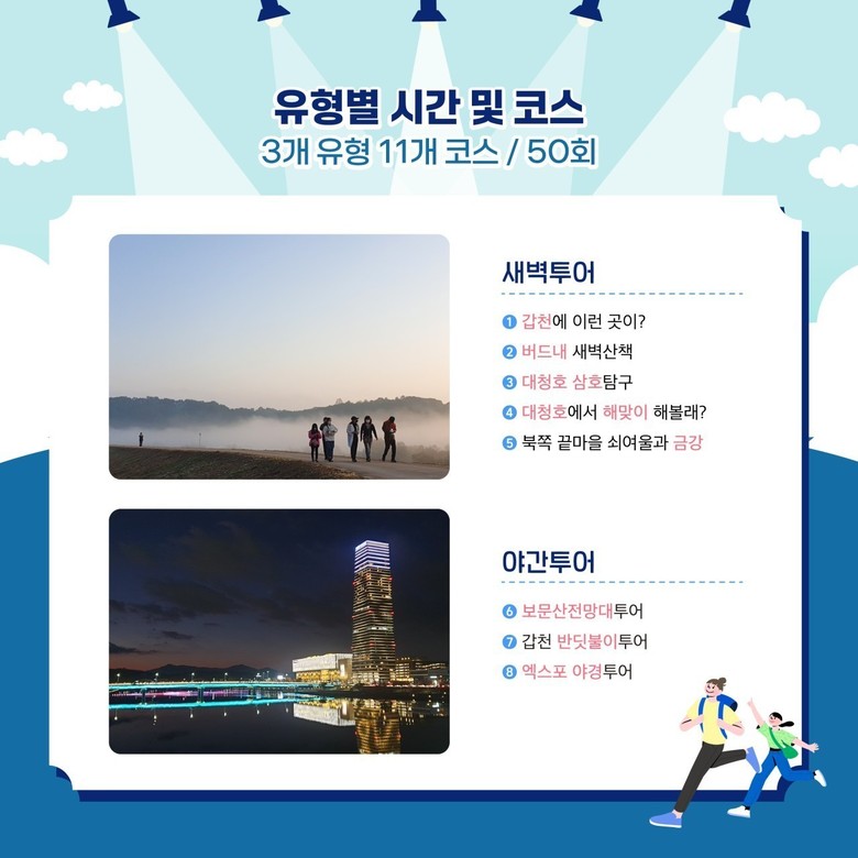 올해 스토리투어는 새벽투어 16회, 야간투어 7회, 테마투어 27회 등 3개 유형 11개 코스로 구성되며, 총 1,100명 참여를 목표로 한다. 참가비는 1인 1만 원이다.