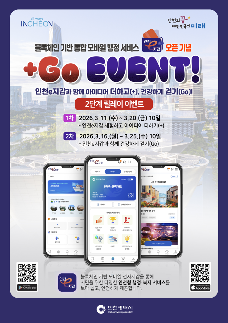 인천시는 서비스 개시를 기념해 3월 11일부터 3월 25일까지 시민이 앱 주요 기능을 직접 체험할 수 있는 “인천e지갑과 함께 아이디어 더하고(+), 건강하게 걷기(Go)!” 릴레이 이벤트를 진행한다.