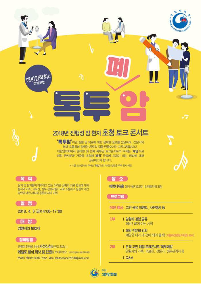 대한암학회(이사장 김열홍)는 4월 6일 오후 2시 서울 중구 페럼타워 페럼홀에서 진행성 폐암 환자 초청 ‘톡투암 토크콘서트’를 개최한다.