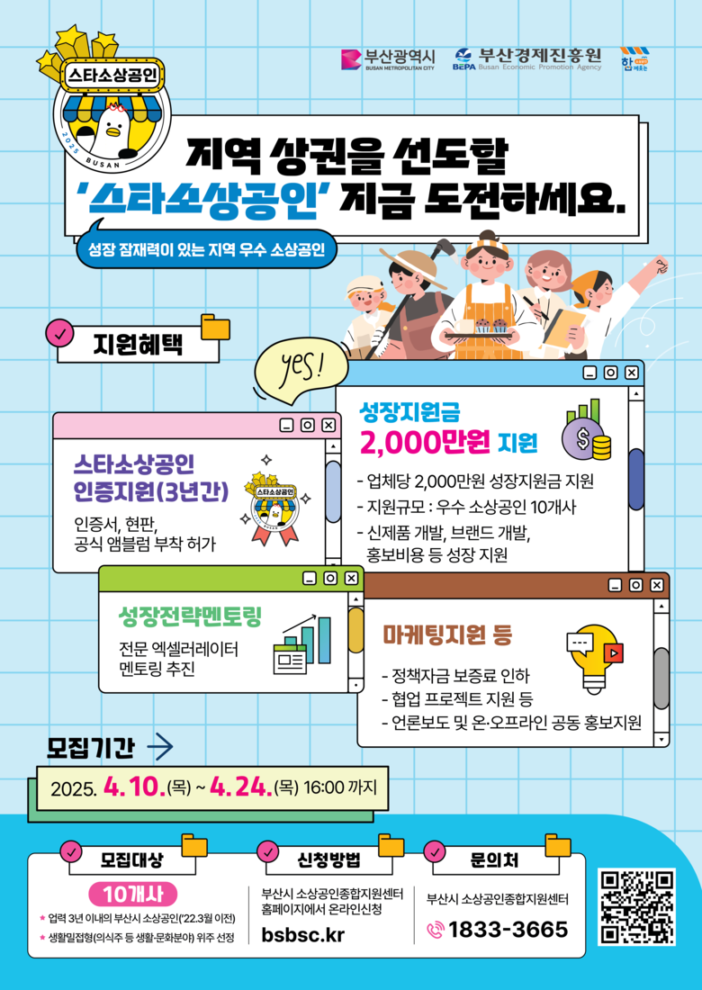 ◈ 공모 참가는 4.10.부터 4.24. 16:00까지 시 소상공인종합지원센터 누리집(bsbsc.kr)에서 할 수 있어 [부산 세계타임즈=이용우 기자] 부산시(시장 박형준)는 (재)부산경제진흥원(원장 송복철)과 함께 오늘(10일)부터 4월 24일까지 「2025년 부산시 스타소상공인 공모」를 진행한다고 밝혔다.