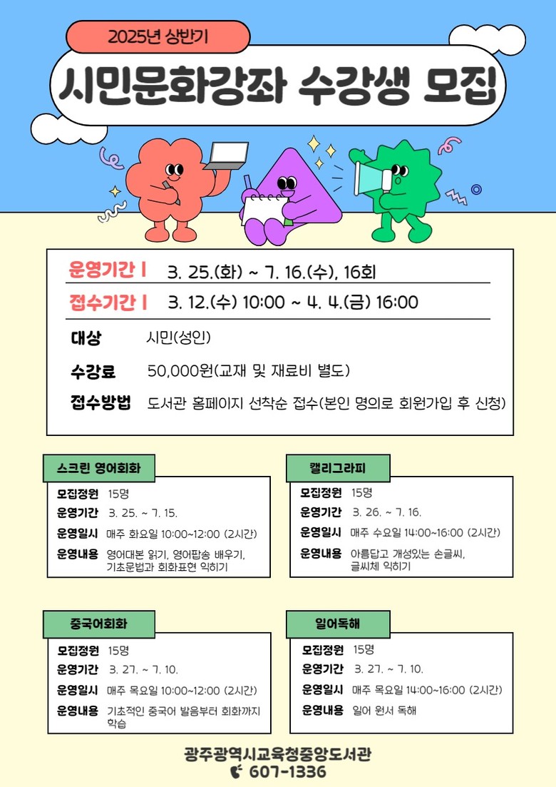 광주중앙도서관은 전문강사진을 초빙해 ▲스크린영어회화 ▲캘리그라피 ▲중국어회화 ▲일어 독해 등 4개 강좌를 개설하고 오는 3월 25일부터 7월 16일까지 운영한다.