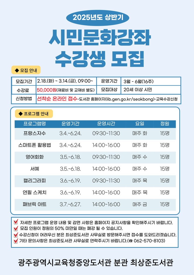 자세한 내용은 각 도서관 누리집 또는 전화(광주중앙도서관 https://lib.gen.go.kr/jungang/, 062-607-1336, 최상준도서관 https://lib.gen.go.kr/seokbong/, 062-570-8103)로 확인할 수 있다.