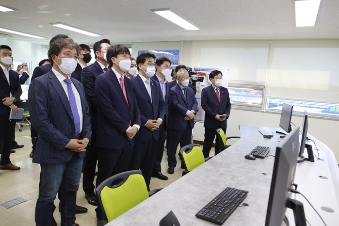 [세계타임즈 이진화 기자]국민의힘 이준석 대표가 14일 오후 인천 중구 인천항 갑문상황실을 방문해 내항재개발 관련 설명을 듣고있다.
