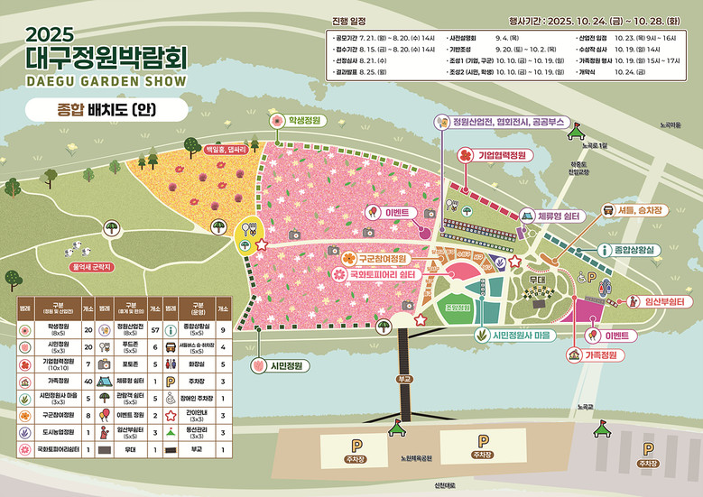 한편, 행사의 시작을 알리는 개막식은 24일(금) 오전 10시 30분 하중도 메인무대에서 열린다. 내빈·정원조성 참여자·시민 등 300여 명이 참석한 가운데 김정기 대구시장 권한대행의 개회사를 시작으로 개막 퍼포먼스, 우수작품 시상, 가드닝 패션쇼 등이 진행된다.