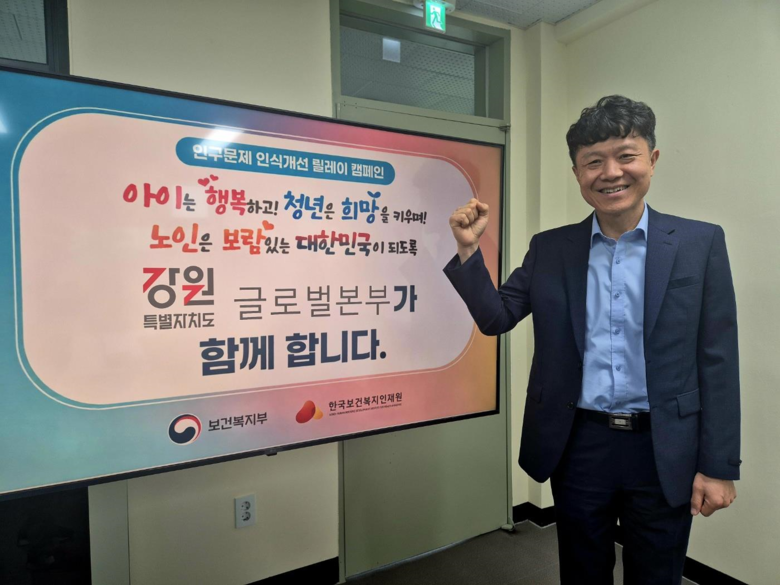 [강원도 세계타임즈=김민석 기자] 강원특별자치도 글로벌본부(본부장 손창환)는 인구감소와 고령화로 인한 사회적 문제에 대한 경각심을 높이고, 국민적 공감과 협력을 유도하기 위해 ‘인구문제 인식개선 릴레이 캠페인’에 참여했다고 밝혔다.
