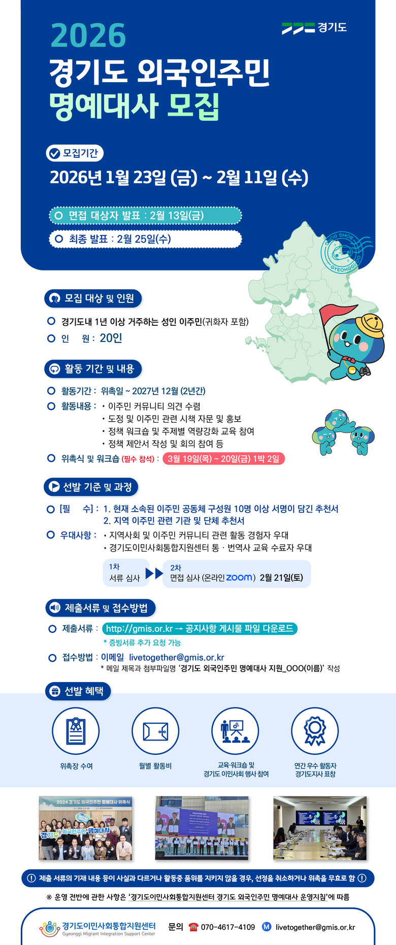 모집 대상은 경기도에 1년 이상 거주하고 있는 성인 외국인주민으로, 귀화자를 포함한다. 이민사회 정책에 관심을 가지고 지역사회에서 이주인권 관련 활동을 희망하는 사람은 경기도이민사회통합지원센터 누리집을 통해 제출 서류를 내려받아 2월 10일 오후 5시까지 전자우편으로 제출하면 된다.