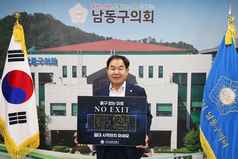 [남동구 세계타임즈=심하린 기자] 남동구의회 오용환 의장이 최근 마약의 위험성을 알리고 마약 범죄 예방을 위해 진행 중인 ‘노 엑시트(NO EXIT)’ 마약 예방 캠페인에 동참했다.