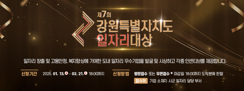 [강원도 세계타임즈=김민석 기자] 강원특별자치도(도지사 김진태, 이하 ‘도’)는 도내 우수 일자리 창출 기업을 발굴하고 시상하는 「제7회 강원특별자치도 일자리대상」 공모를 실시한다고 밝혔다. 이 사업은 올해 7회째로 G1방송, 강원특별자치도경제진흥원과 공동으로 추진하는 사업이다.