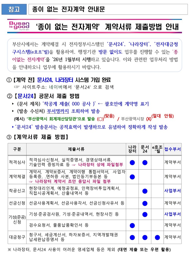 ◈ 계약상대자의 행정기관 방문 불편 해소, 인쇄용지 등 절감 통해 탄소중립 실현, 전자문서로 보관하여 효율적 업무 수행 기대 [부산 세계타임즈=송민수 기자] 부산시(시장 박형준)는 내년(2026년) 1월부터 '종이 없는 전자계약'을 추진한다고 밝혔다.