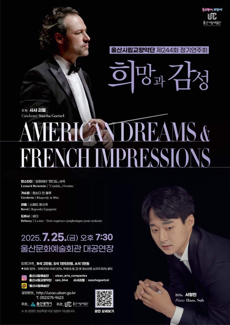 본 베토벤 국제 피아노 콩쿠르 우승자 피아니스트 서형민 협연 [울산 세계타임즈=이호근 기자] 울산시립교향악단은 오는 7월 25일(금) 오후 7시 30분 울산문화예술회관 대공연장에서 제244회 정기연주회 ‘희망과 감성(American Dreams & French Impressions)’을 무대에 올린다.
