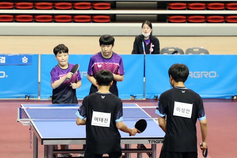 이어 동천체육관에서 열린 세종시 학생선수단(박경준·김형민)의 남자복식 탁구 경기를 관람하며 응원했다.
