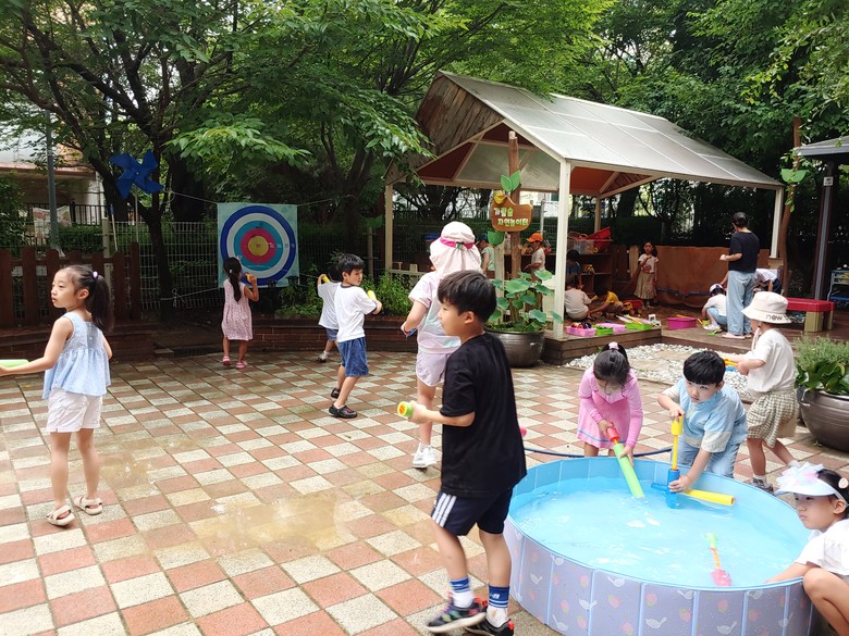 [파주시 세계타임즈=송민수 기자] 7월 19일 파주 공립 단설 한가람유치원 앞마당에는 물놀이 테마파크가 개장하였다. 한가람초등학교 1학년 학생과 한가람유치원 숲가람반 친구들이 만나 ‘모래놀이터에서 공룡 화석 찾기, 물총으로 과녁 맞추기, 물풍선으로 라바에게 물뿌리기, 대형 비눗방울 만들기’놀이가 실시되었다. 놀이에 참여한 숲가람반 유아는 “모든 에너지를 다 쏟았어요. 형님들과 함께여서 너무 너무 재미있었어요.”라며 활짝 웃었다. 다양한 여름 놀이를 함께 즐긴 형님과 아우들은 9월 ‘가람숲 자연놀이터 캠핑 놀이’에서 다시 만나기로 약속하며 교실로 돌아갔다.